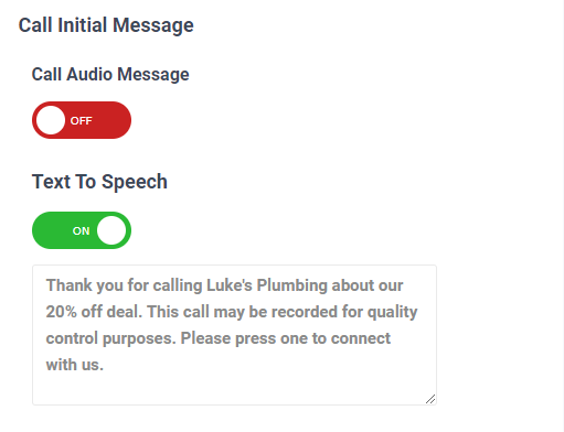 Your callers, which most of the time will be prospective customers should hear a professional greeting. You can also customize the greeting in the campaign to the offer itself!