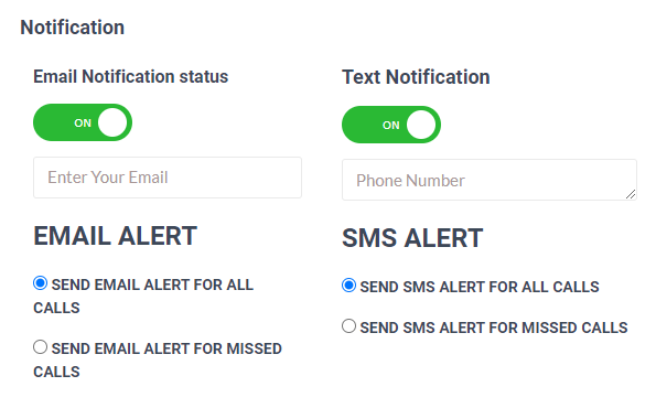 You have the option of getting instantly notified by text and/or email of all lead calls, or just missed lead calls. Or set to no notifications.