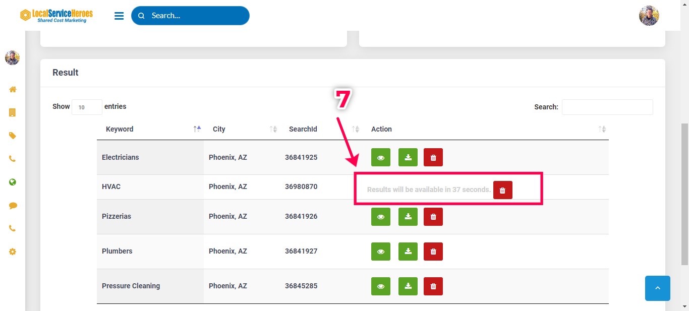 7. As the results are being generated, you'll see a countdown in the table below the search area. Just refresh your page periodically to get the latest results. Especially if you're doing a bulk search as they will come in one at a time.